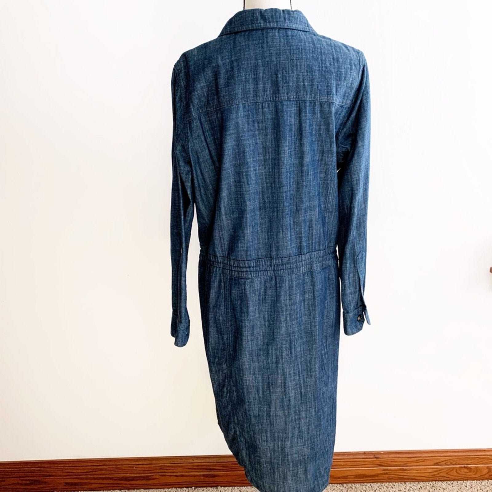 CJ Banks Blue Chambray Denim Look Shirtdress Button Front Drawstring Waist size 14W. Good pre-owned condition, no flaws noted. Sleeves have roll tab option to shorten.