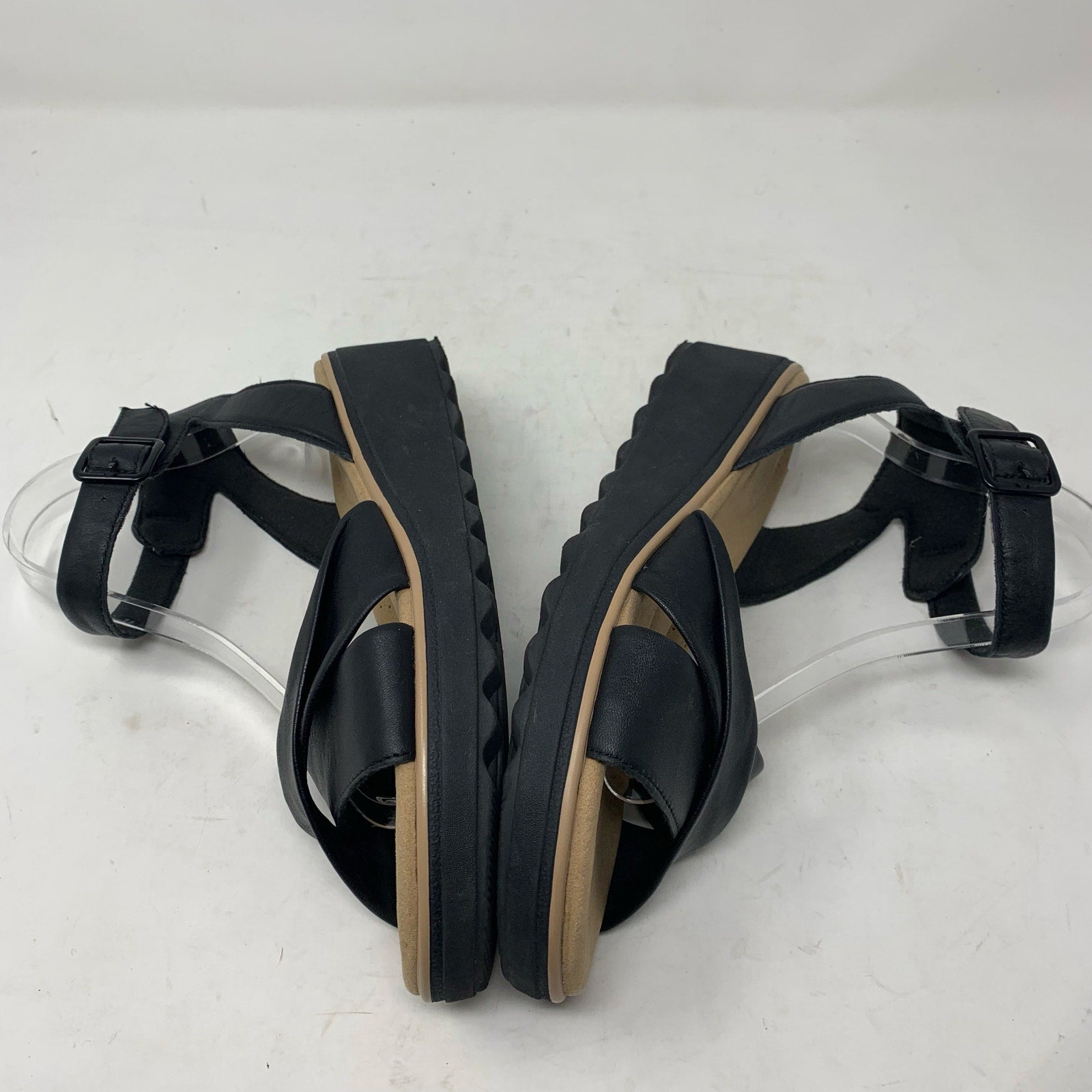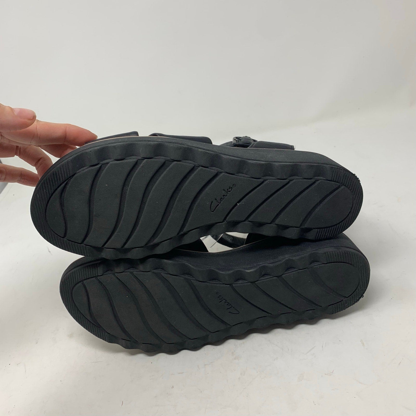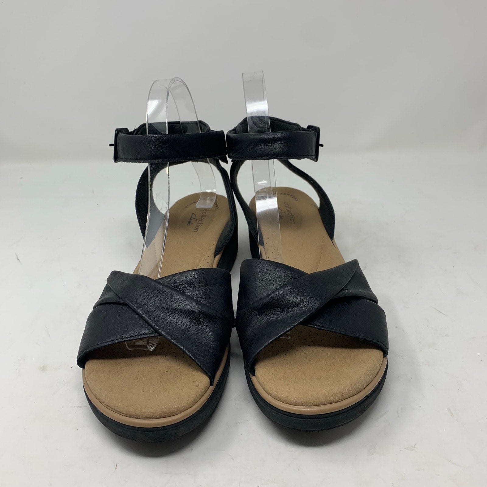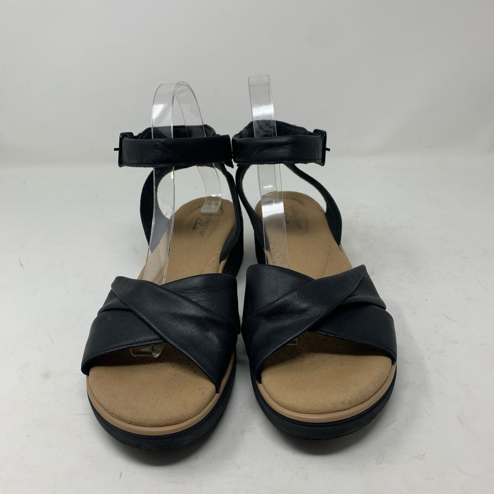 Clarks Collection Jillian Bella Black Leather Ankle Strap Sandal Size 9 Platform. Good pre-owned condition with minor imperfections consistent with normal wear, so please see all photos.