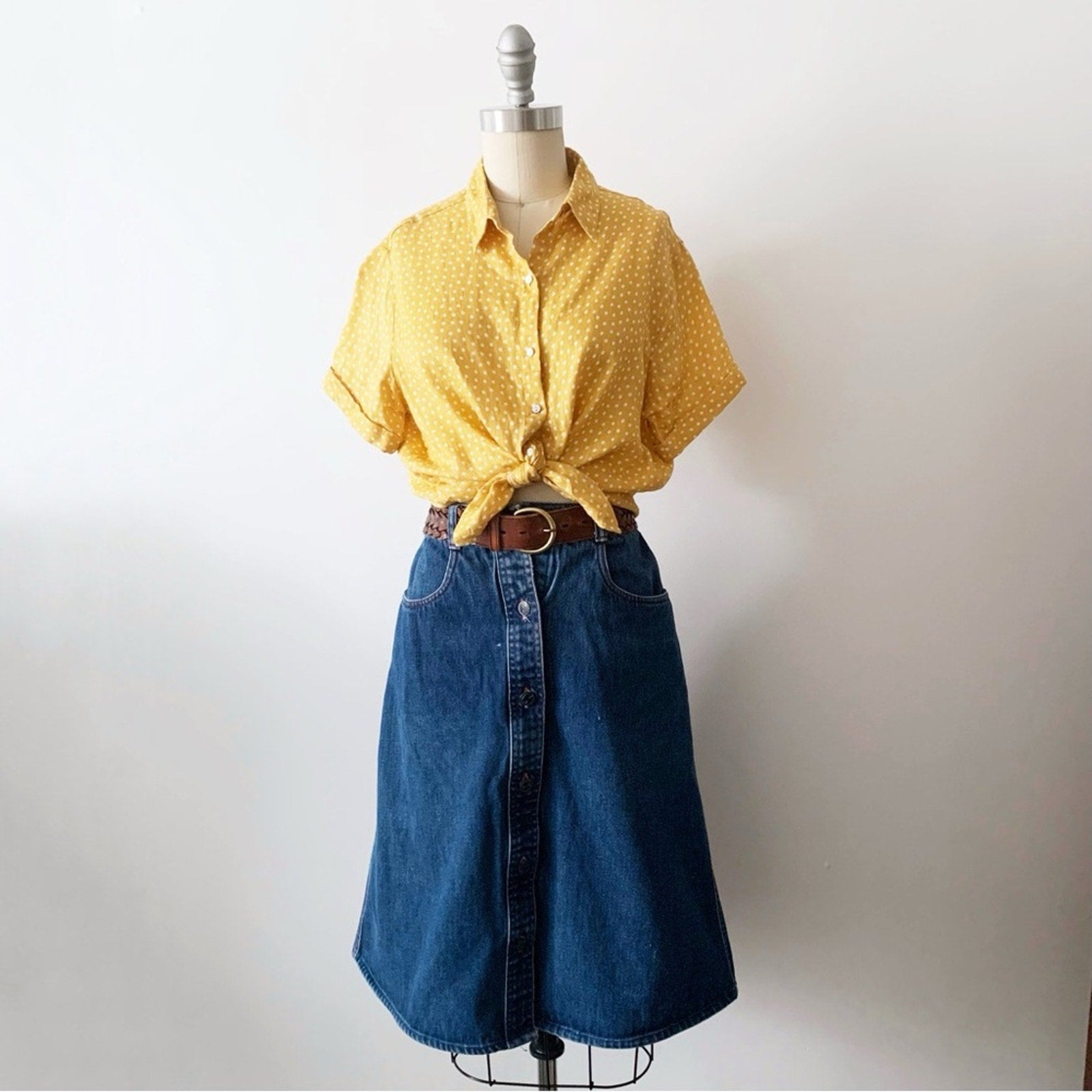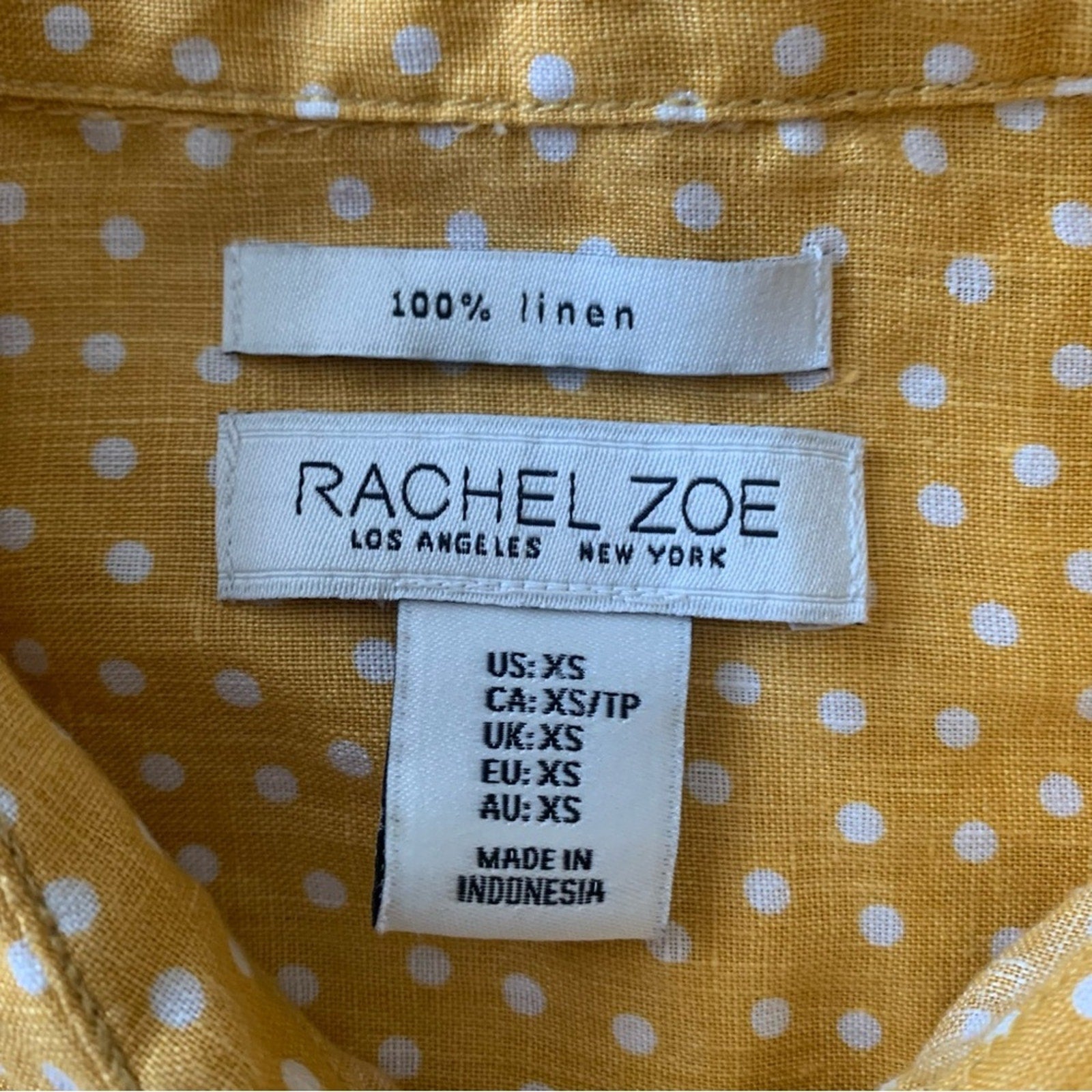 Rachel Zoe XS Linen Yellow Polka Dot Womens Top Short Cuffed Sleeve Button Shirt. Brighten your wardrobe with this stylish yellow polka dot top. Perfect for casual outings or a picnic! Can be worn tucked, untucked, or knotted as shown.