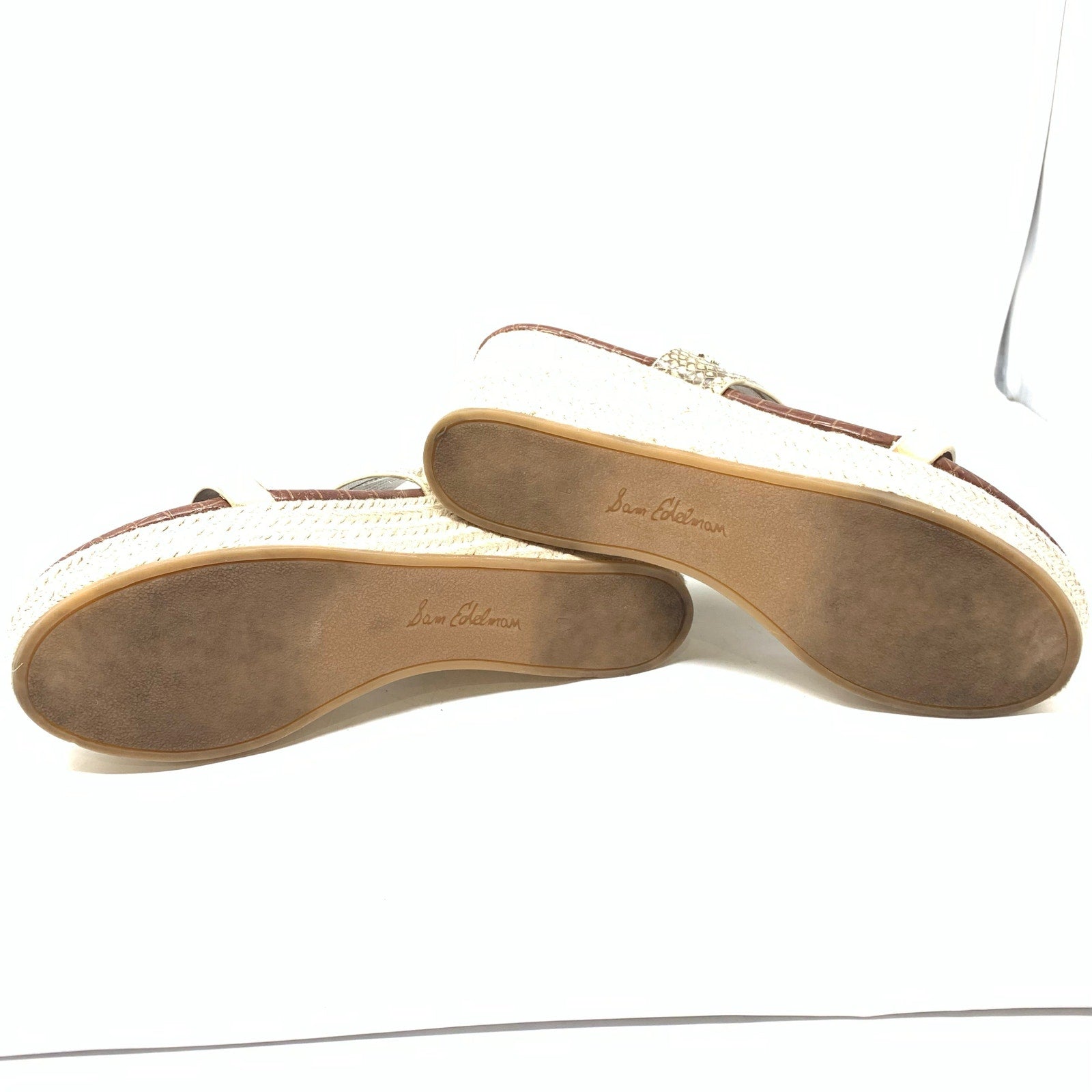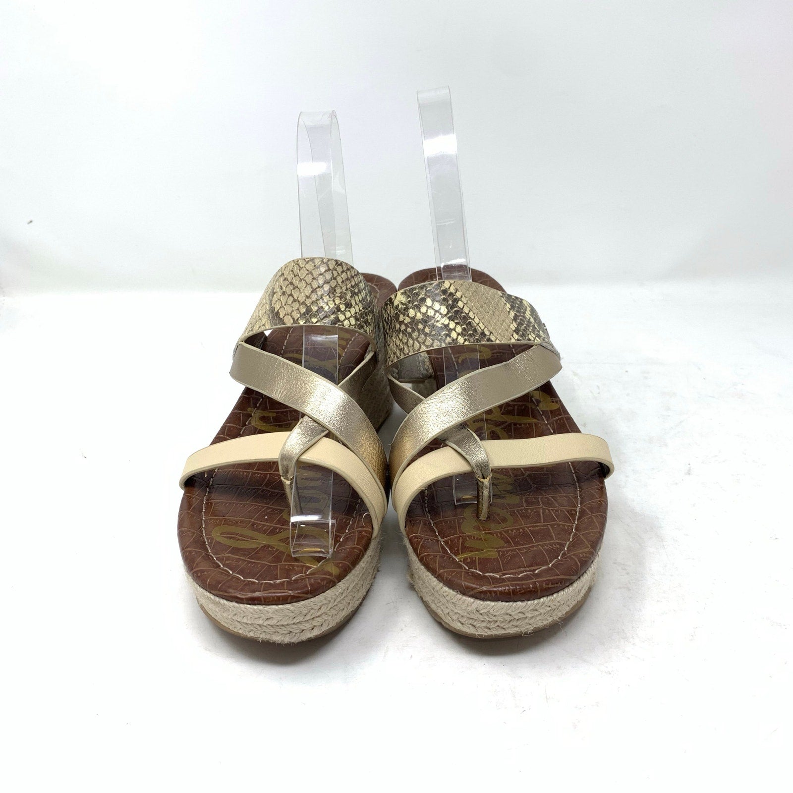 Sam Edelman Raleigh 9 Gold Metallic Snake Print Leather Strappy Wedge Espadrille sandals. Good pre-owned condition with minor imperfections consistent with normal wear, so please see all photos.