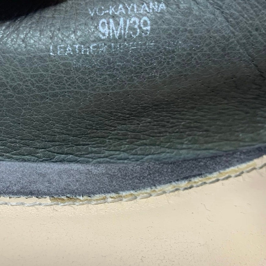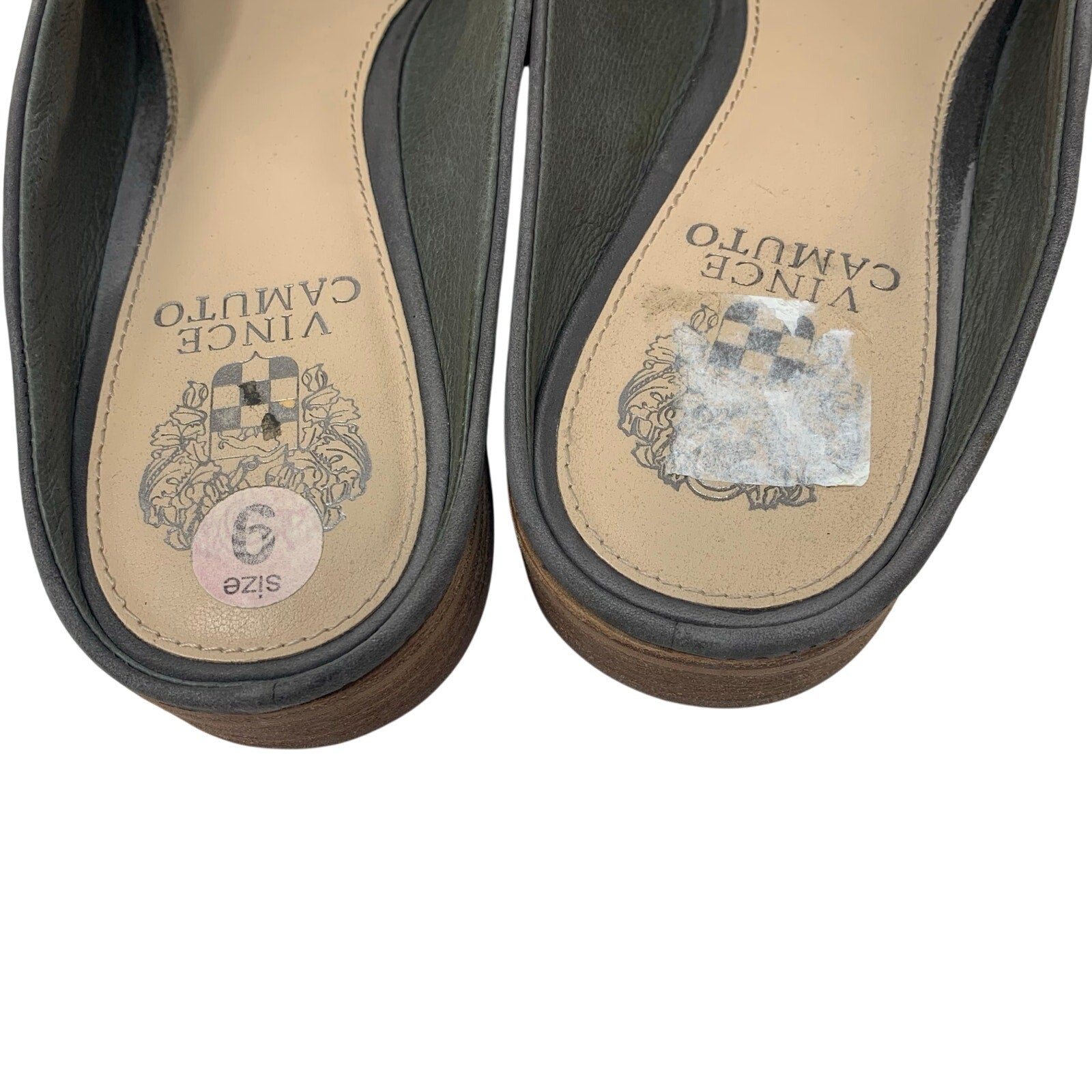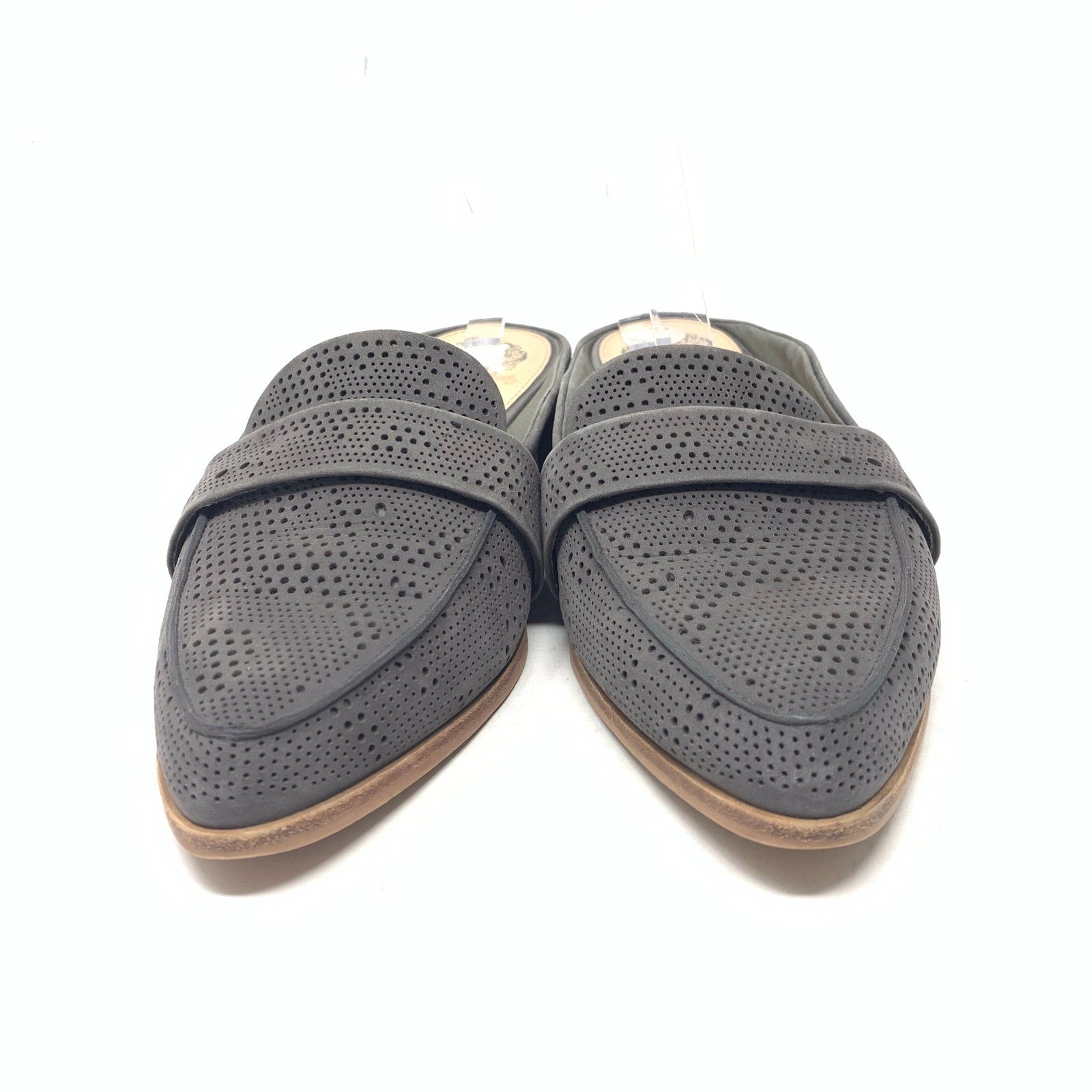 Vince Camuto Kaylana Size 9 Grey Nubuck Leather Mule Loafer Slide Micro Perforated uppers. Good pre-owned condition with minor imperfections consistent with normal wear, so please see all photos. Sticker/residue on insoles as shown.